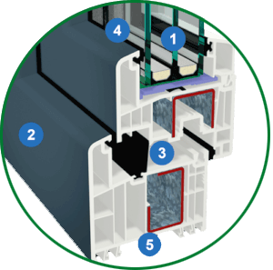 - Sehr gute Wärme- und Schalldämmung durch 6-Kammer-Aufbau und große Bautiefe bei Blendrahmen und Flügel.